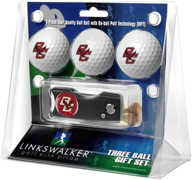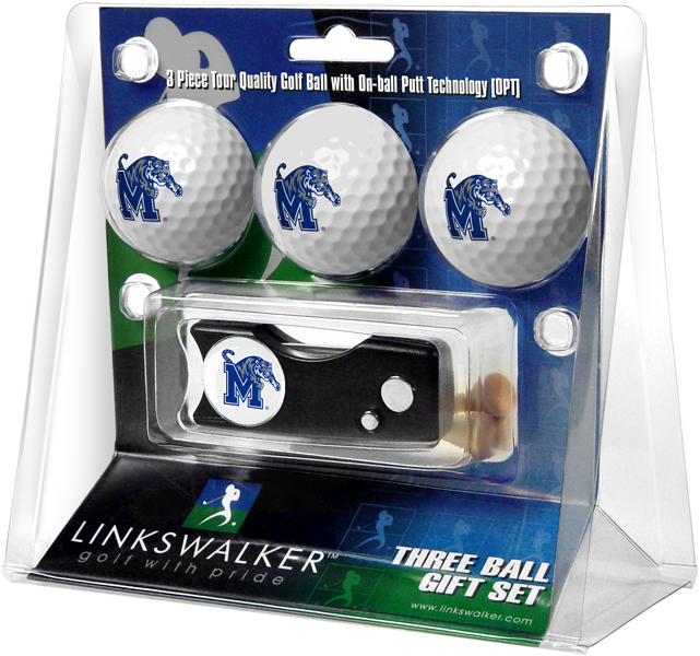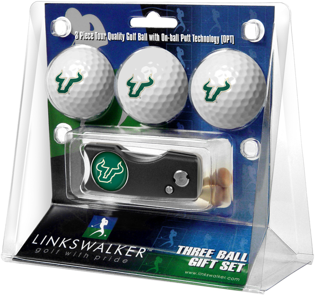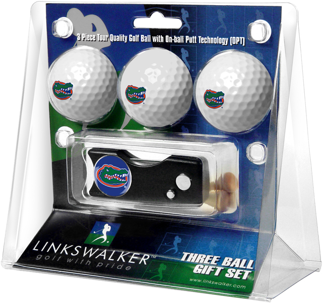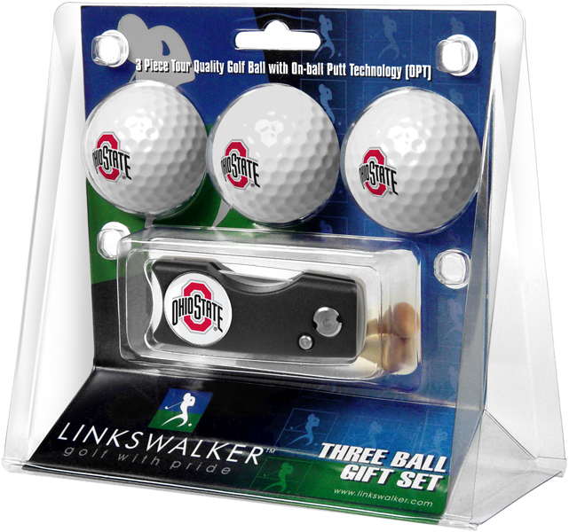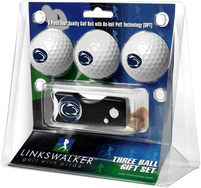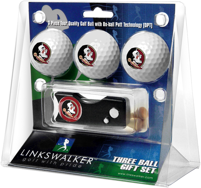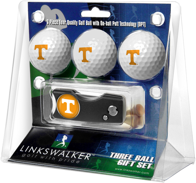 This combination gift pack includes 3 collegiate logo'd LinksWalker ProVictory golf balls featuring On-Ball Putt Technology (OPT), paired with a LinksWalker Spring Action divot tool and 4 wooden golf tees as a bonus.