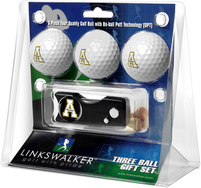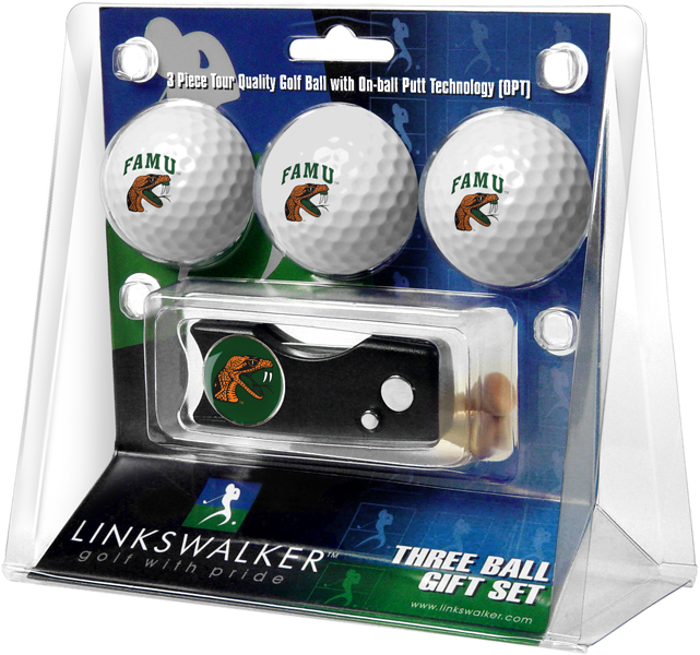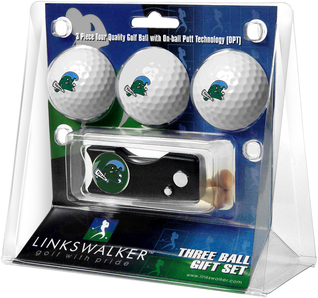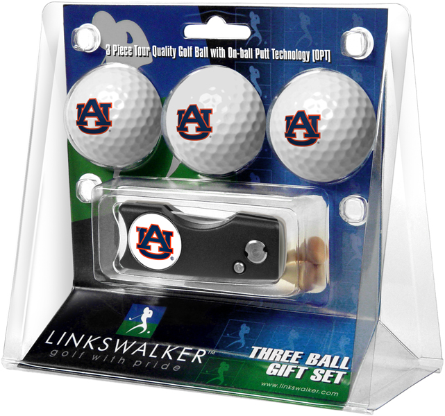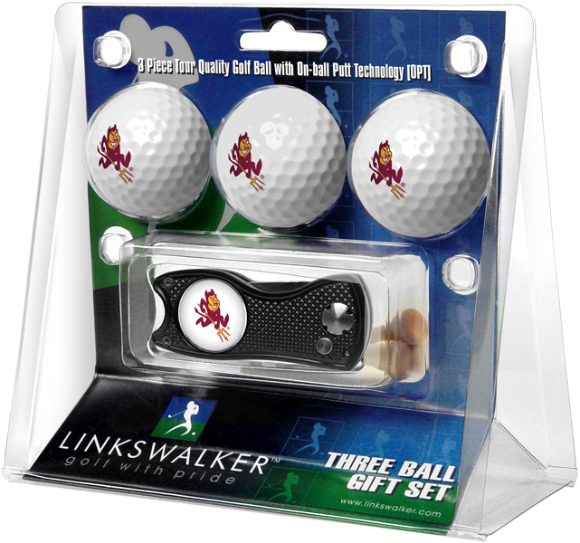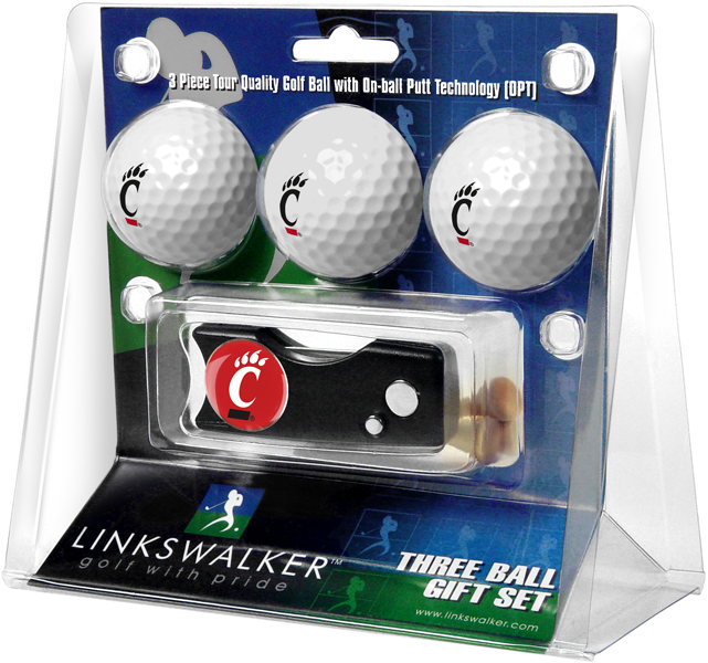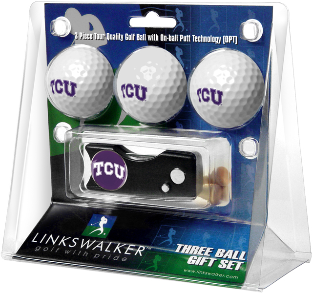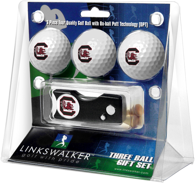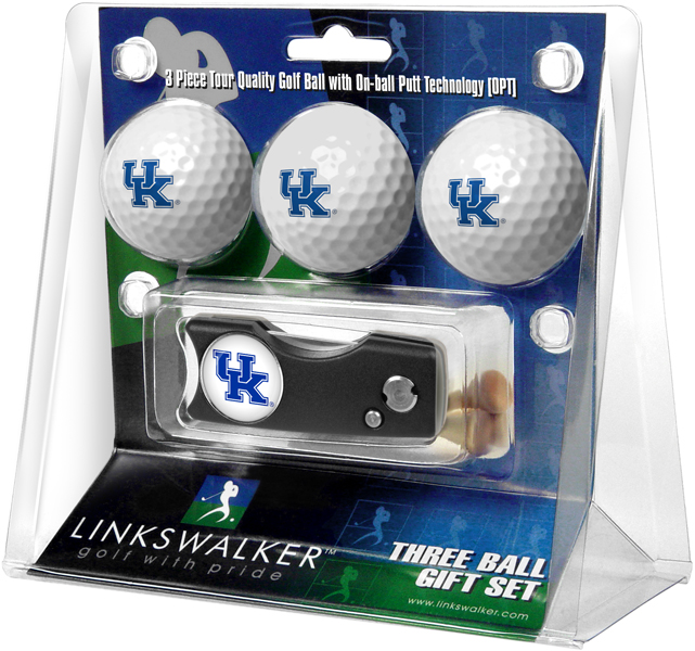 This combination gift pack includes 3 collegiate logo'd LinksWalker ProVictory golf balls featuring On-Ball Putt Technology (OPT), paired with a LinksWalker Spring Action divot tool and 4 wooden golf tees as a bonus.