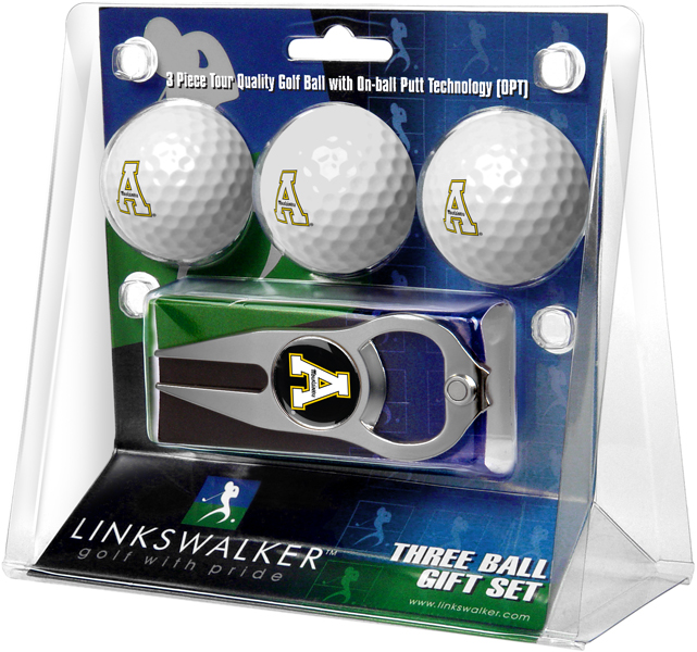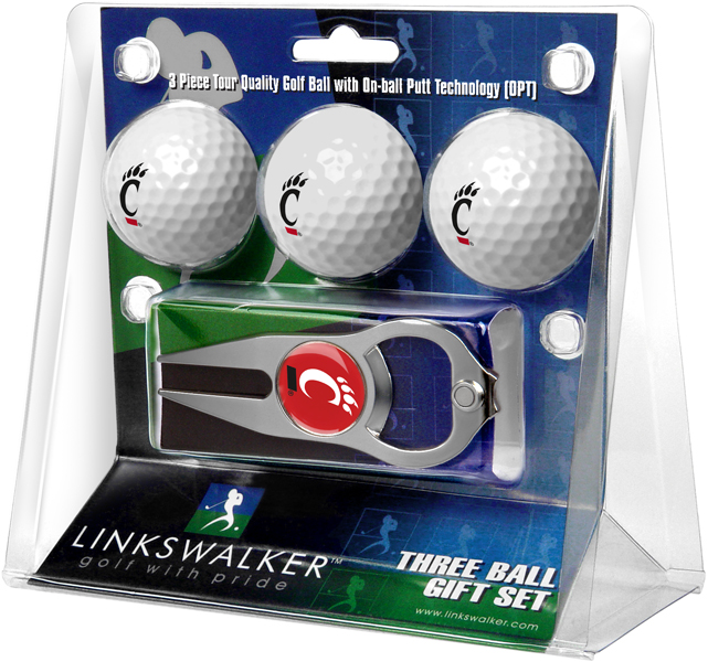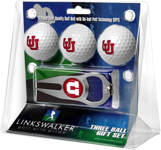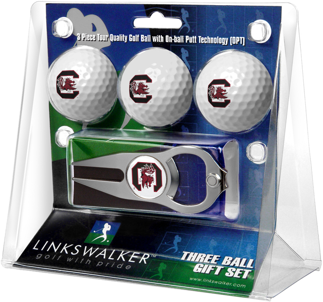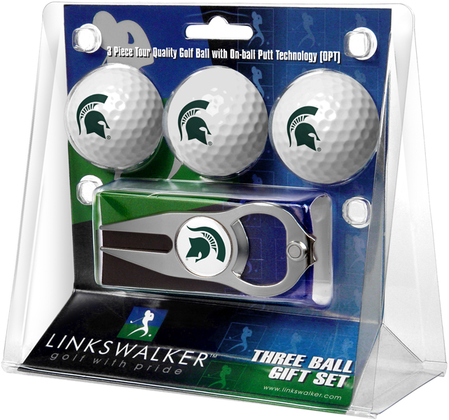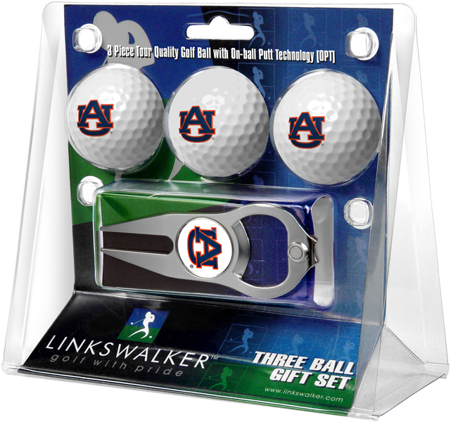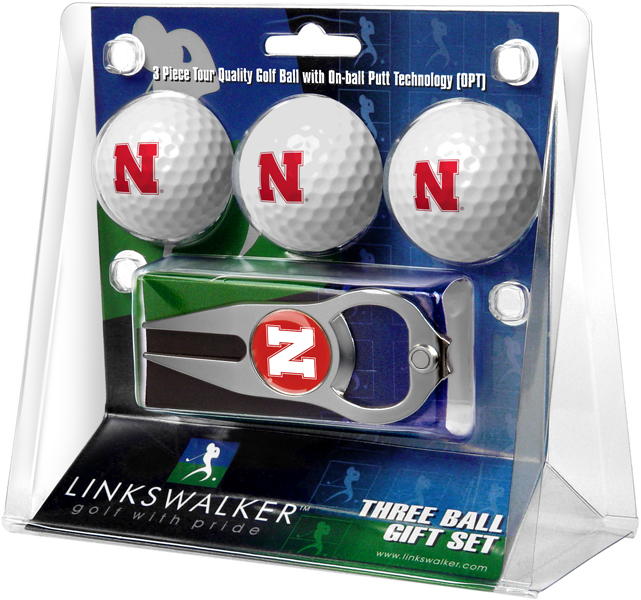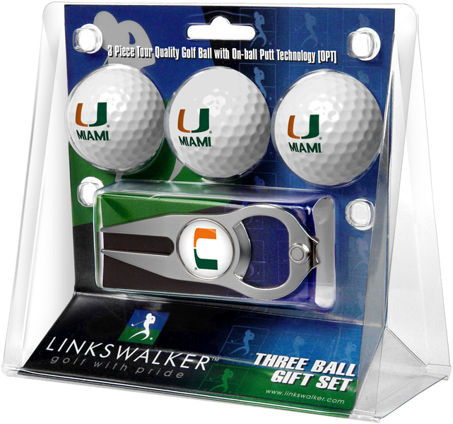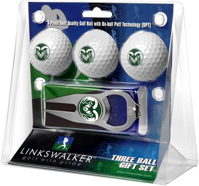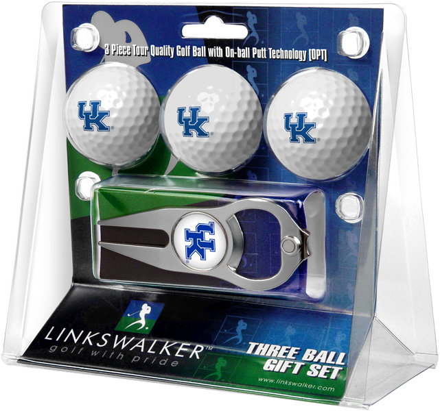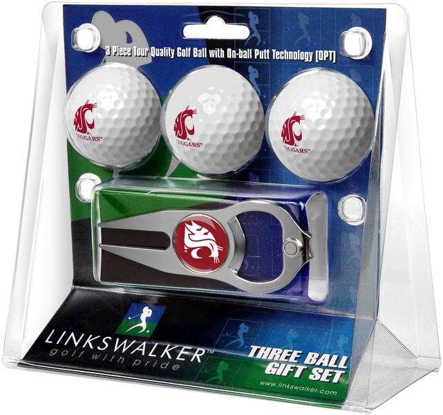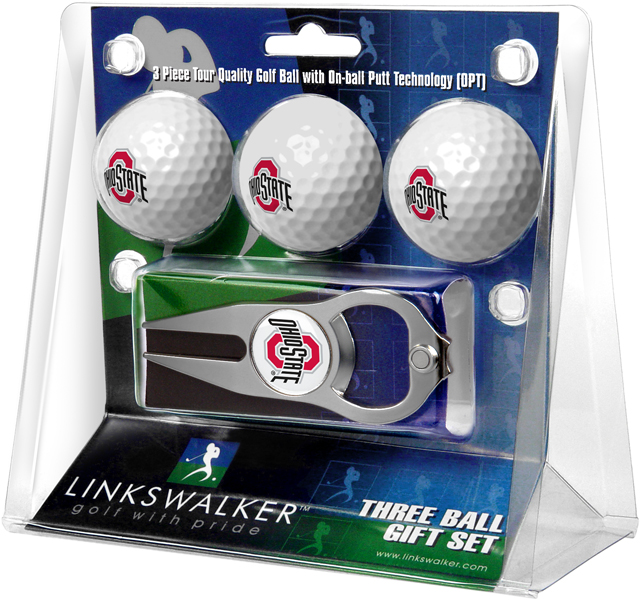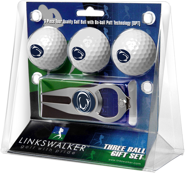This combination gift pack includes 3 collegiate logo'd LinksWalker ProVictory golf balls featuring On-Ball Putt Technology (OPT), paired with a Nickel finished LinksWalker Hat Trick bottle opener divot tool and 4 wooden golf tees as a bonus.