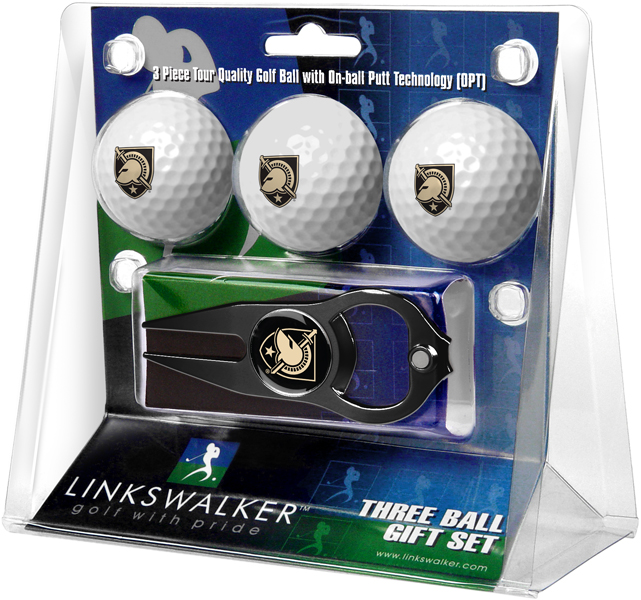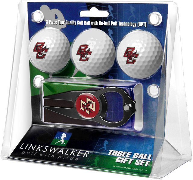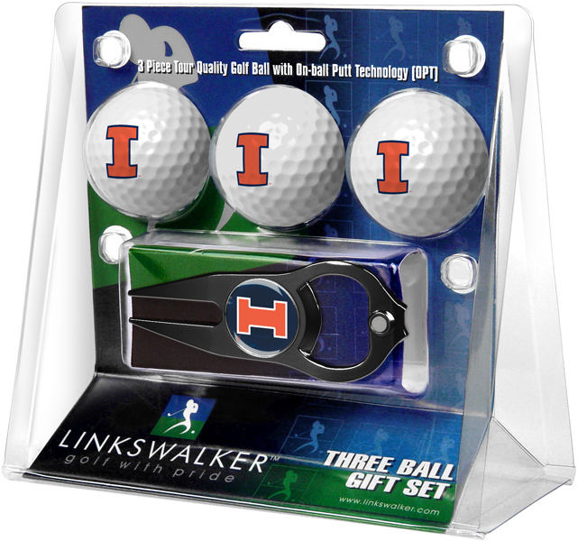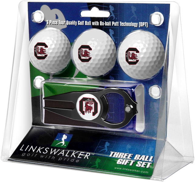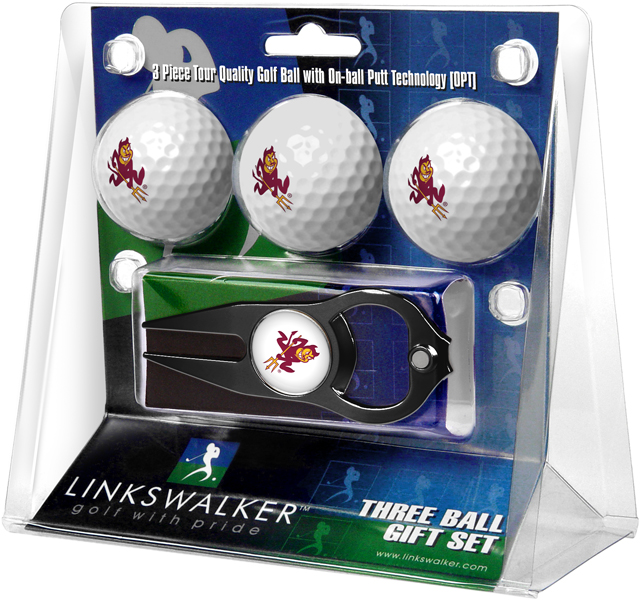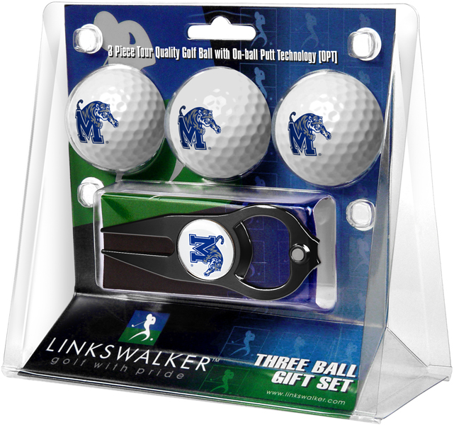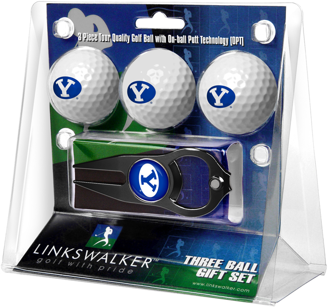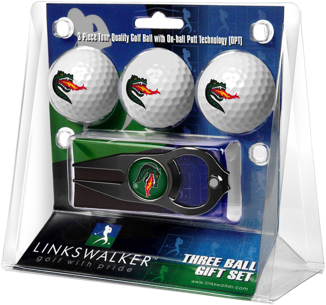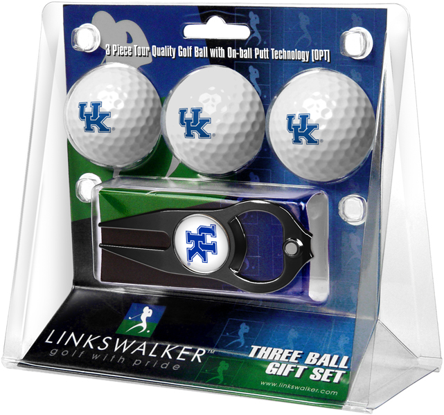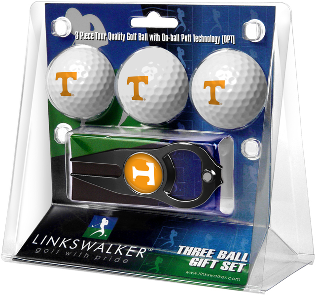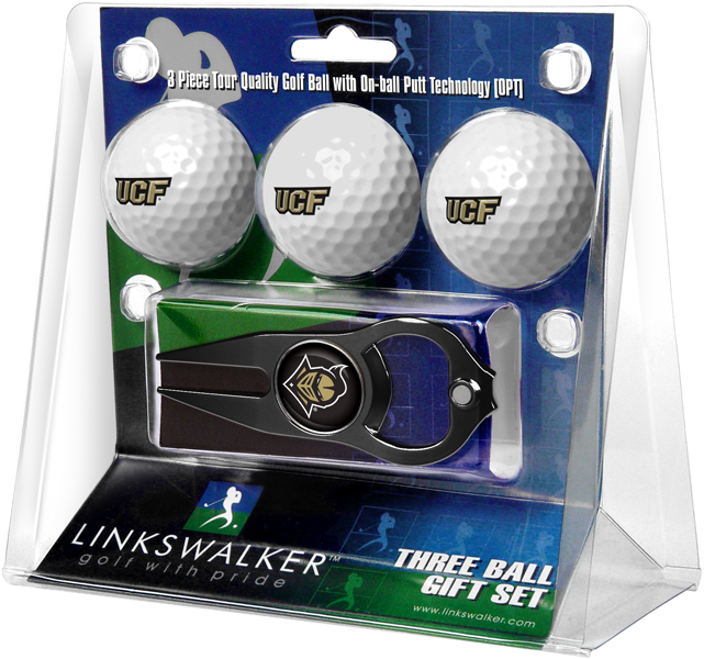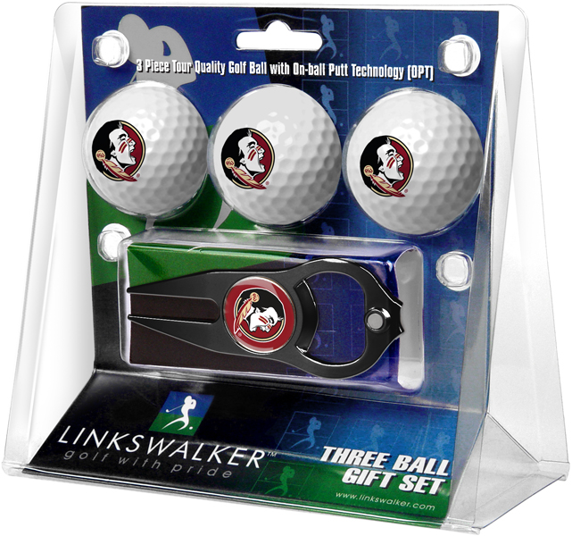 This combination gift pack includes 3 collegiate logo'd LinksWalker ProVictory golf balls featuring On-Ball Putt Technology (OPT), paired with a Black finished LinksWalker Hat Trick bottle opener divot tool and 4 wooden golf tees as a bonus.